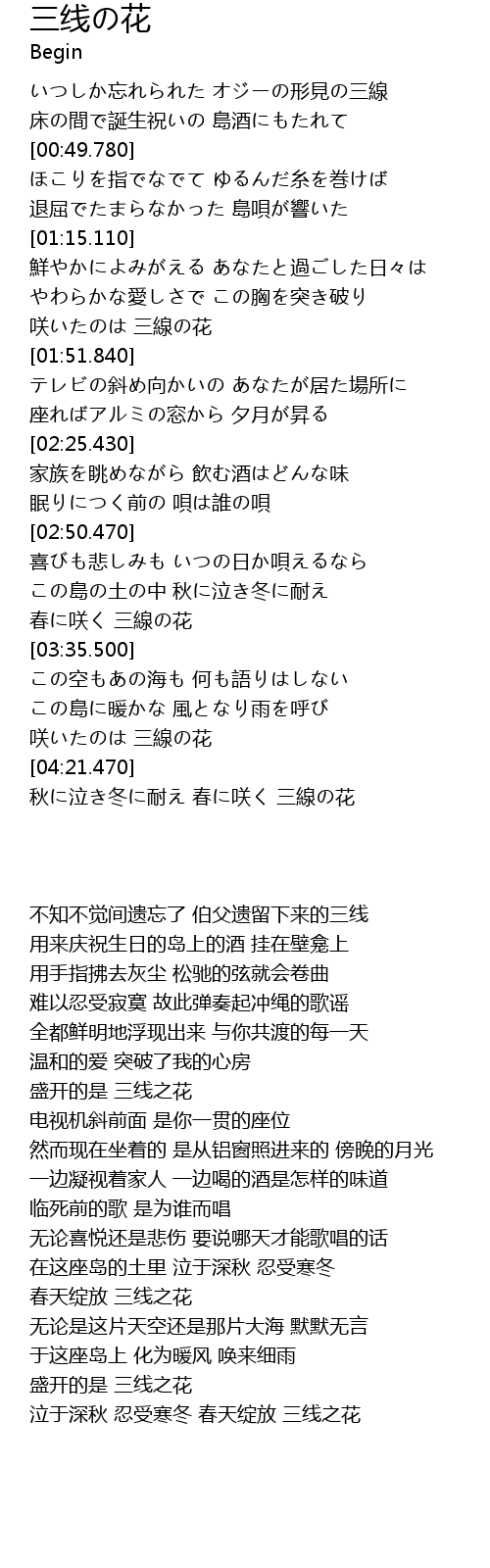 | [04:21.829] | 秋に泣き冬に耐え 春に咲く 三線の花 |