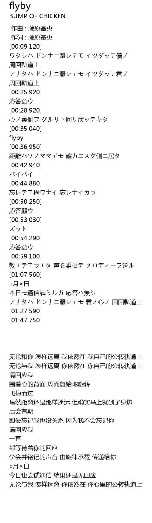| [00:09.590] | ワタシハ ドンナニ離レテモ イツダッテ僕ノ 周回軌道上 |