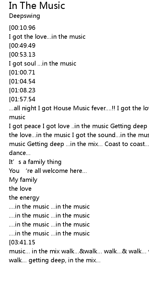| [03:02.12] | I got peace I got love .. in the music Getting deep .. in the mix I got the love in the music I got the sound in the music I got the love in the music Getting deep ... in the mix Coast to coast!! Yeah Everybody dance |