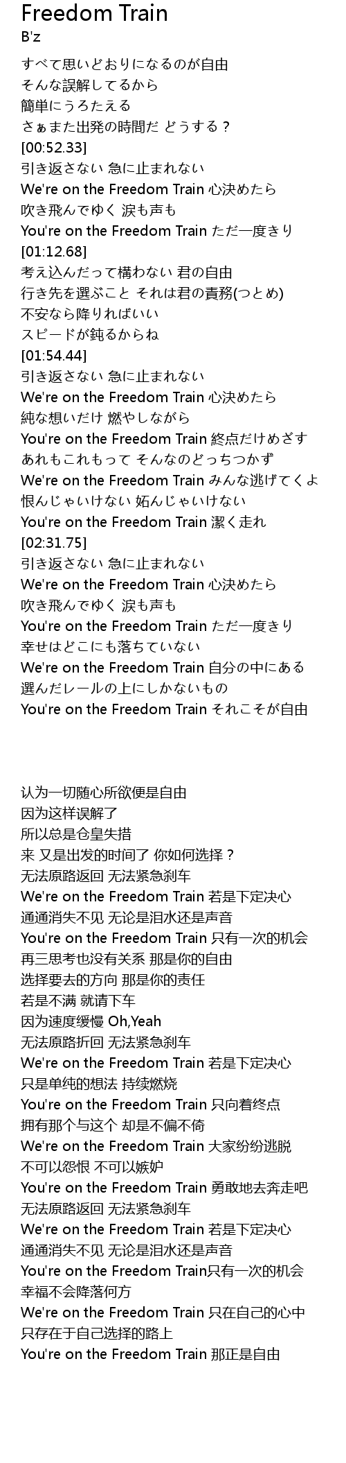 | [02:26.78] | You're on the Freedom Train 潔く走れ |