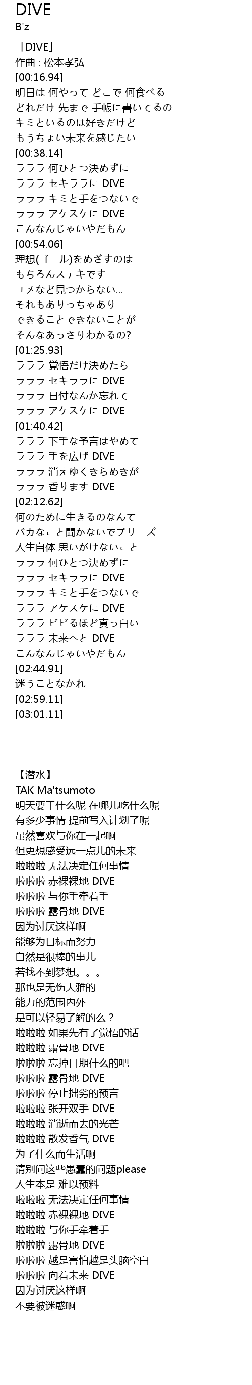 | [02:02.83] | ラララ 手を広げ DIVE |