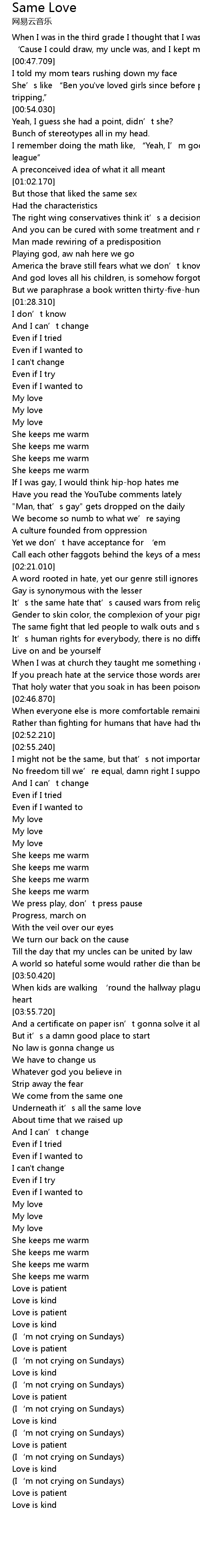 | [04:43.200] | Love is kind |