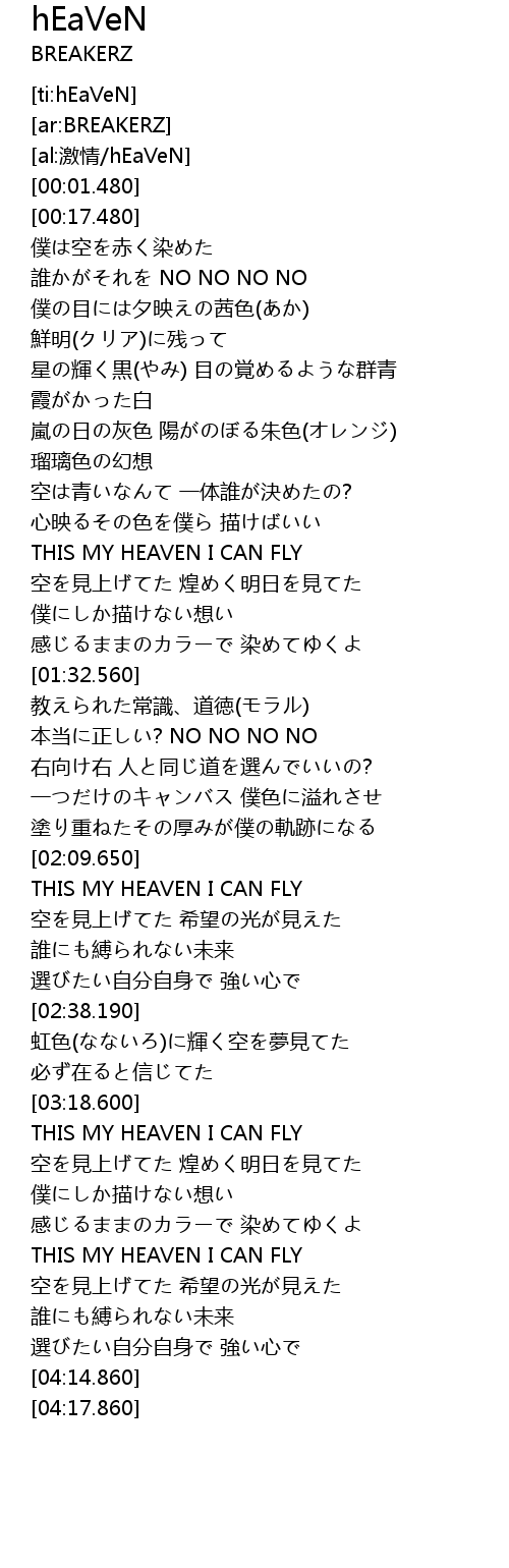 | [02:11.100] | THIS MY HEAVEN I CAN FLY |