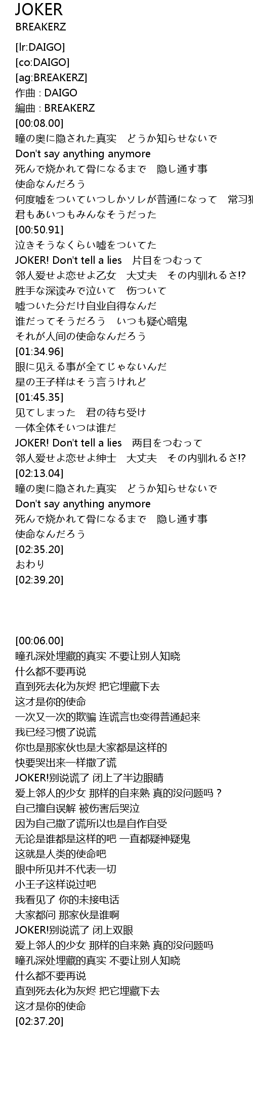 | [00:56.97] | JOKER! Don' t tell a lies piàn mù |