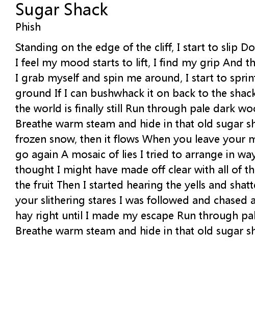 Standing on the edge of the cliff, I start to slip Don't mind if I slide off Now I feel my mood starts to lift, I find my grip And the screaming fades away below I grab myself and spin me around, I start to sprint I climb down to steadier ground If I can bushwhack it on back to the shack behind those hills I'll find the world is finally still Run through pale dark woods to that sugar shack Breathe warm steam and hide in that old sugar shack Boiling heat, maple steam, frozen snow, then it flows When you leave your maple dream wait till spring to go again A mosaic of lies I tried to arrange in ways that shelter the blame I thought I might have made off clear with all of the loot I plucked and ate all the fruit Then I started hearing the yells and shattering plates Drowned out by your slithering stares I was followed and chased and caught and tied up By the hay right until I made my escape Run through pale dark woods to that sugar shack Breathe warm steam and hide in that old sugar shack |