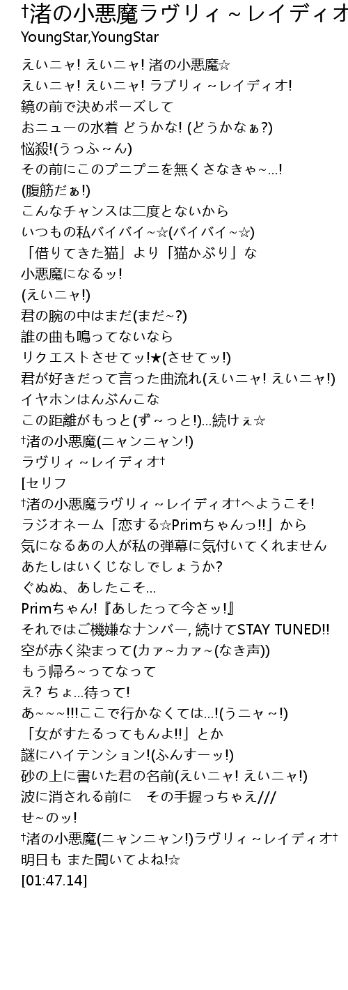 | [01:38.70] | †渚の小悪魔(ニャンニャン!)ラヴリィ~レイディオ† |