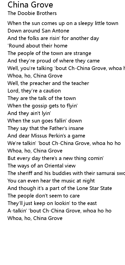A-talkin' 'bout Ch-China Grove, whoa ho ho |