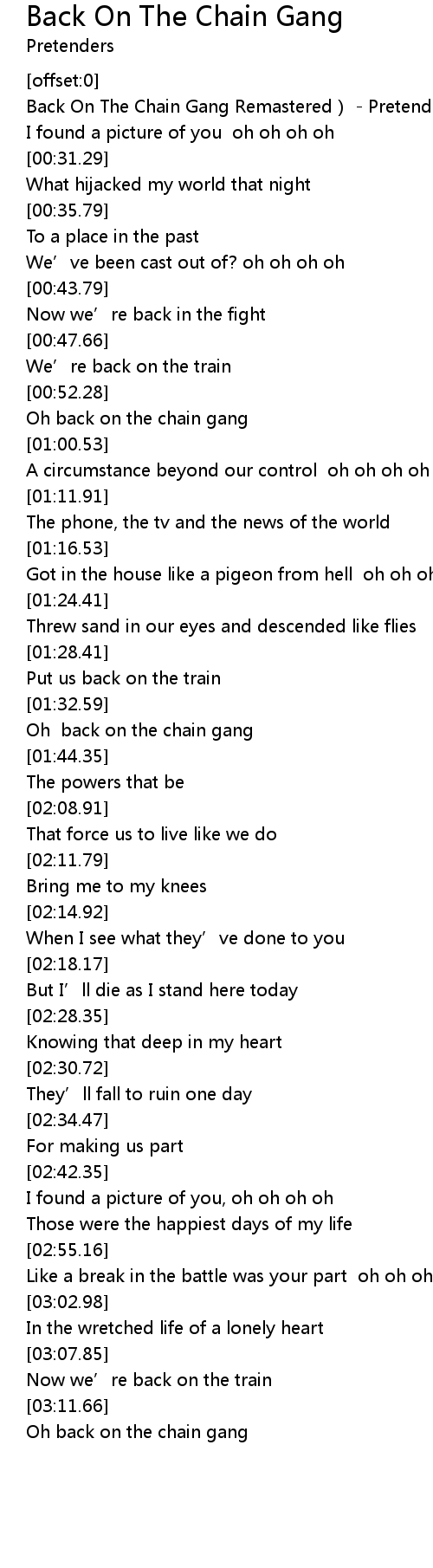 | [00:01.80] | Back On The Chain Gang Remastered Pretenders |
