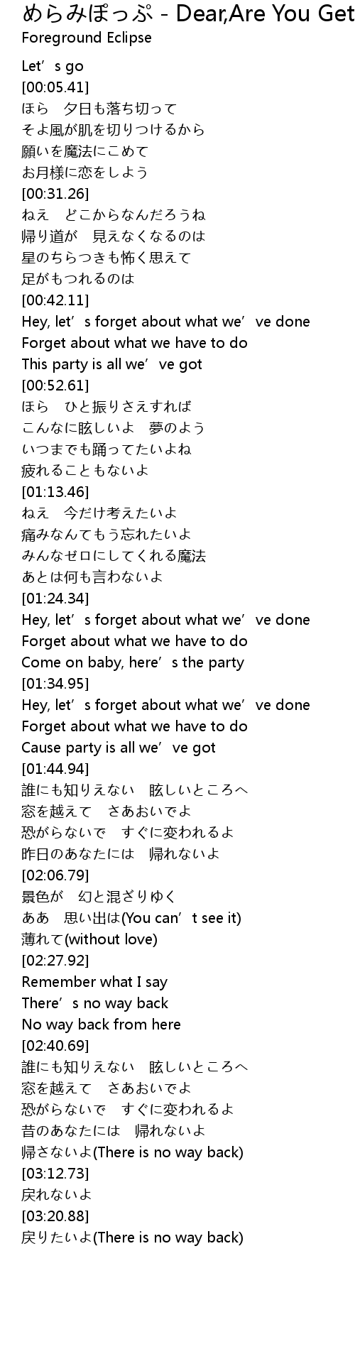| Song | めらみぽっぷ - Dear,Are You Getting Sober |