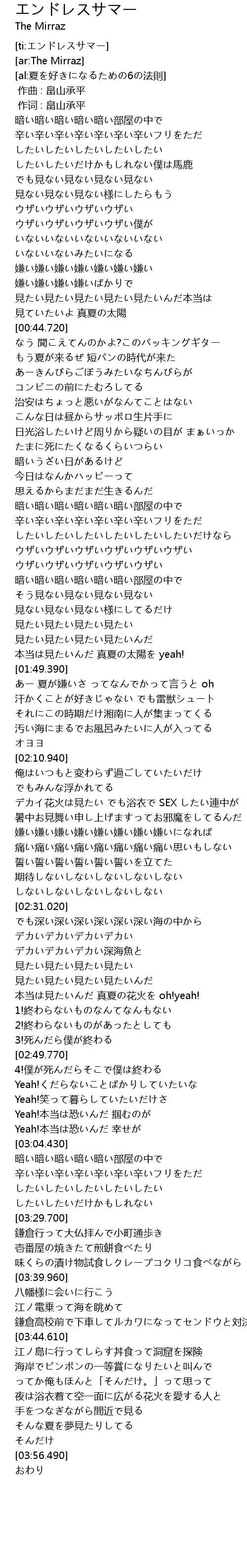 | [01:59.880] | あー 夏が嫌いさ ってなんでかって言うと oh |