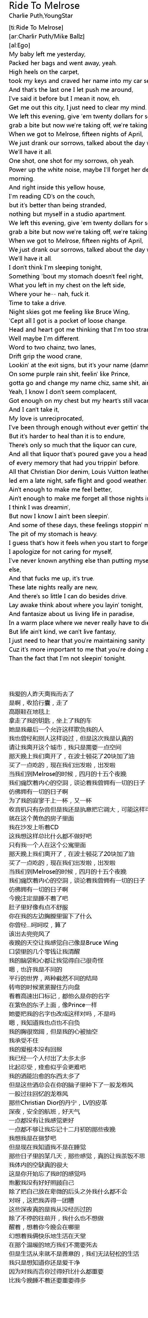 | [00:57.970] | Get me out this city, I just need to clear my mind. |