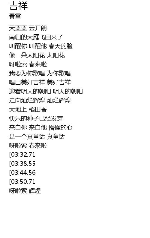 | [04:02.85][03:38.55][03:11.17] | 唱出美好吉祥 美好吉祥 |