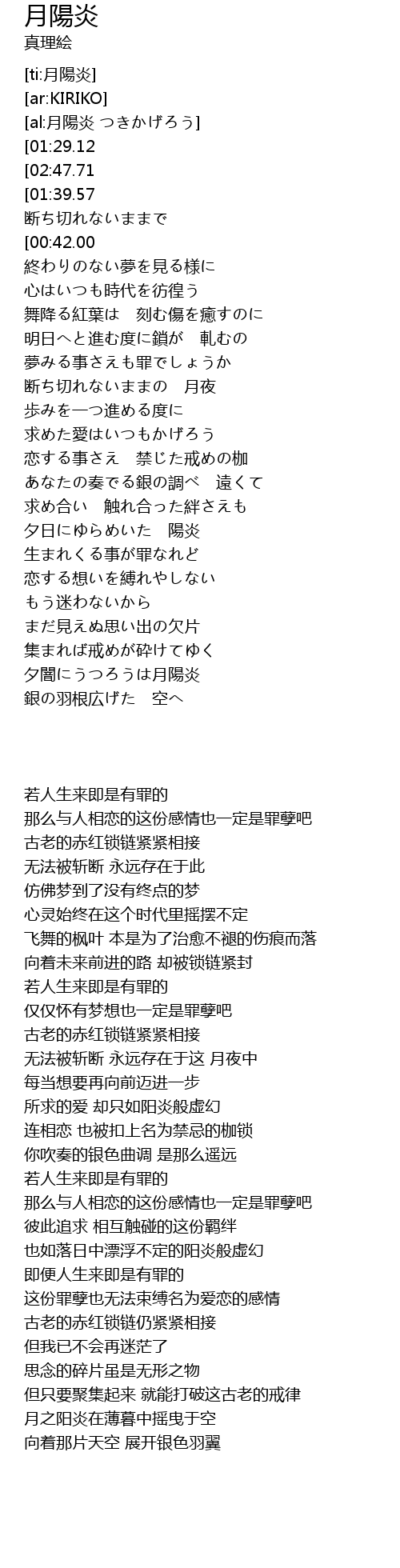 | [00:00.00][01:29.12][02:42.21] | 生まれ来る事が罪ならば |
