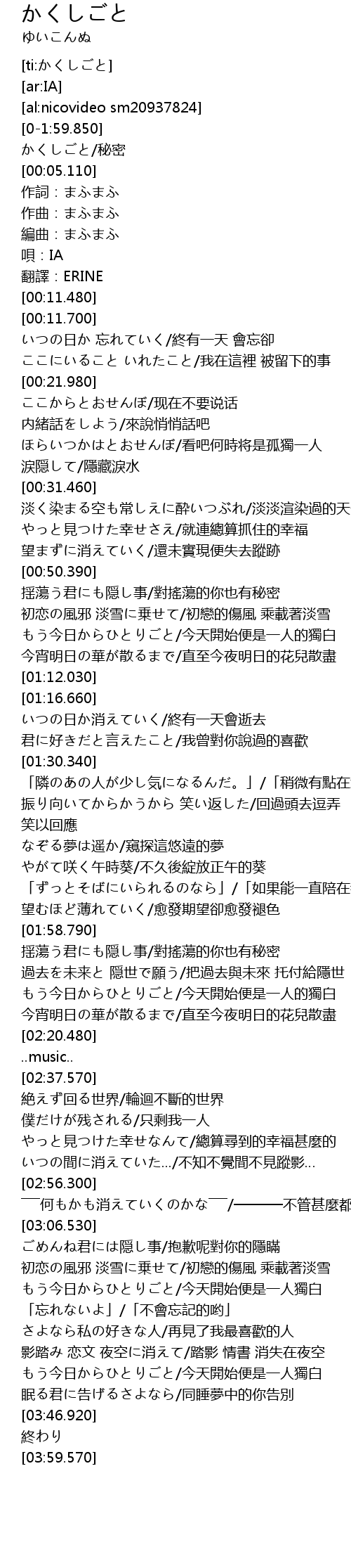 | [01:59.140] | 揺蕩う君にも隠し事/對搖蕩的你也有秘密 |