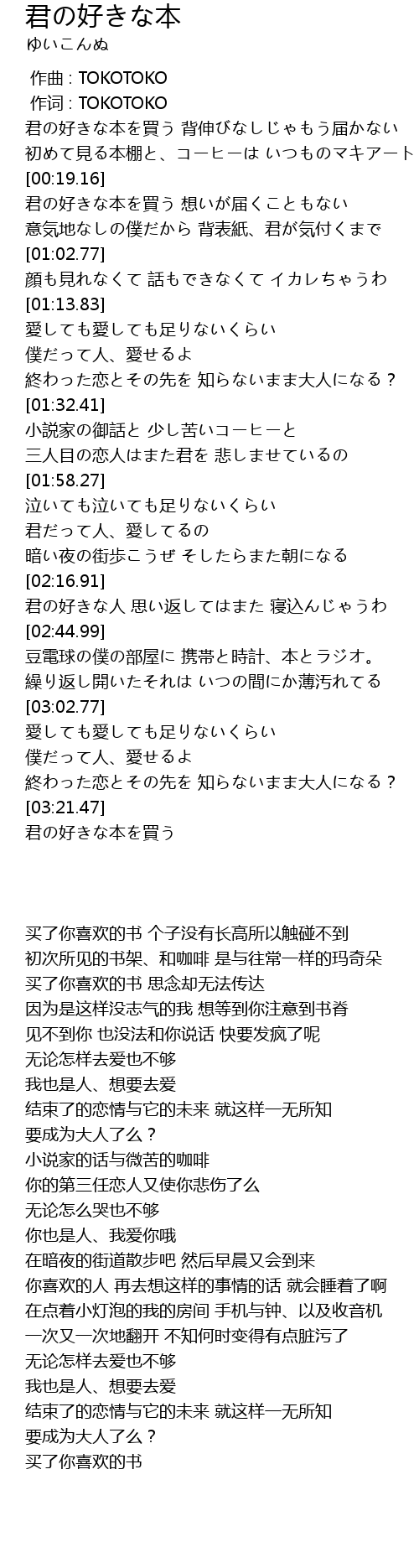 | [00:45.73] | 君の好きな本を買う 想いが届くこともない |