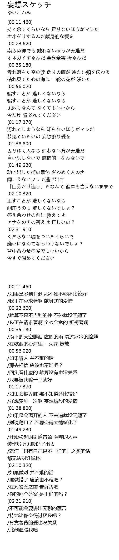 | [01:33.340] | 梦见ていたいの 妄想癖な爱を |