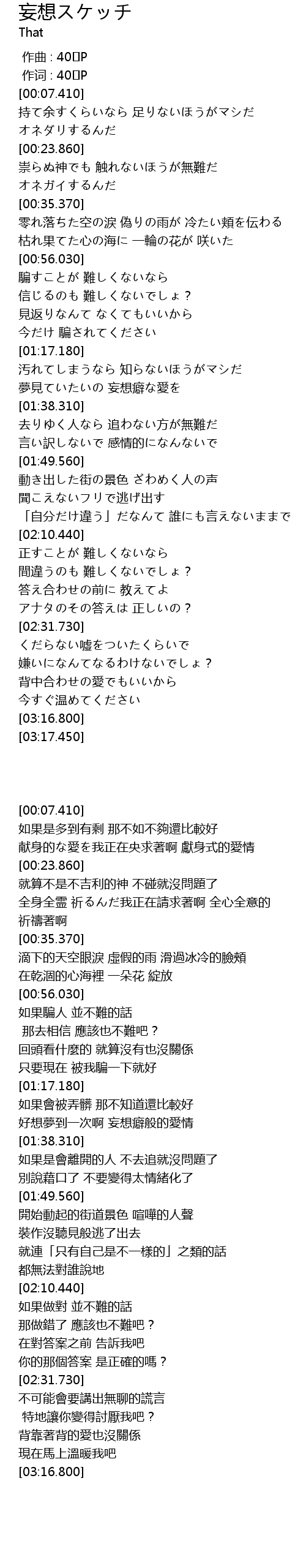 | [00:01.00] | 作词 : 40㍍P |