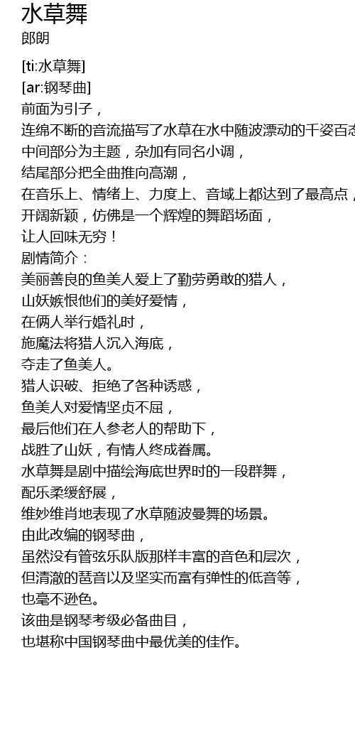 | [01:41.778] | 水草舞是剧中描绘海底世界时的一段群舞, |