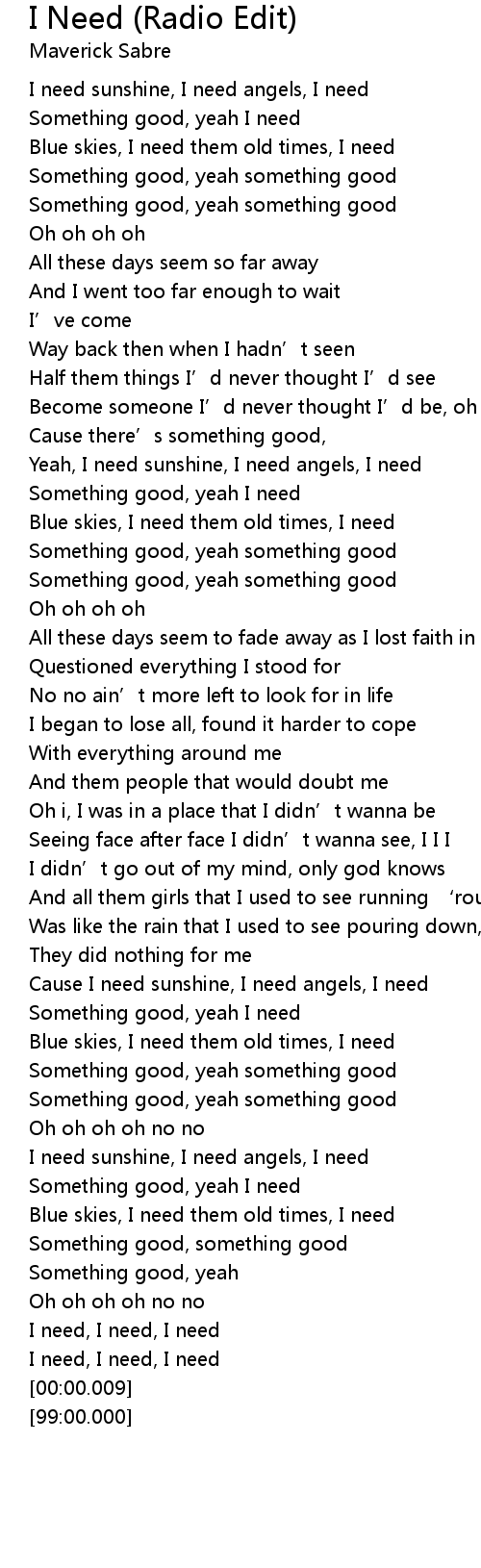 | [02:04.07] | Cause I need sunshine, I need angels, I need |
