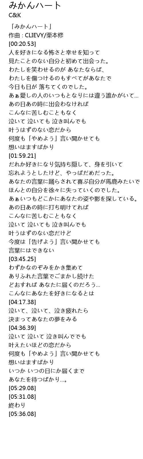 | [00:59.96] | あぁ愛しの人のいつもとなりには違う誰かがいて... |