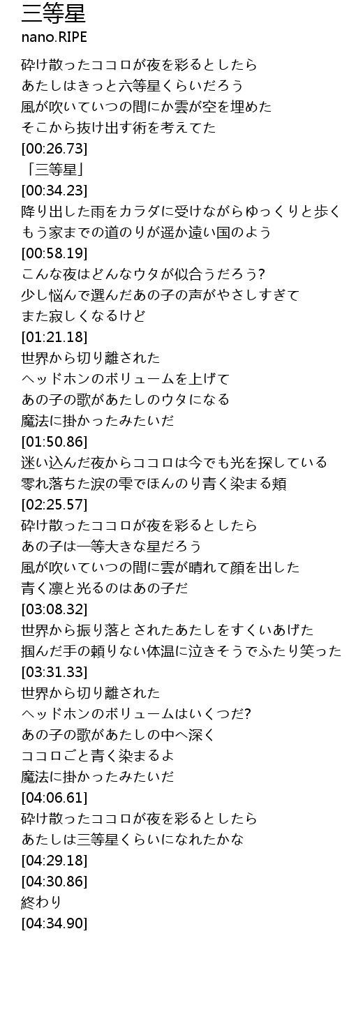 | [04:22.22] | あたしは三等星くらいになれたかな |