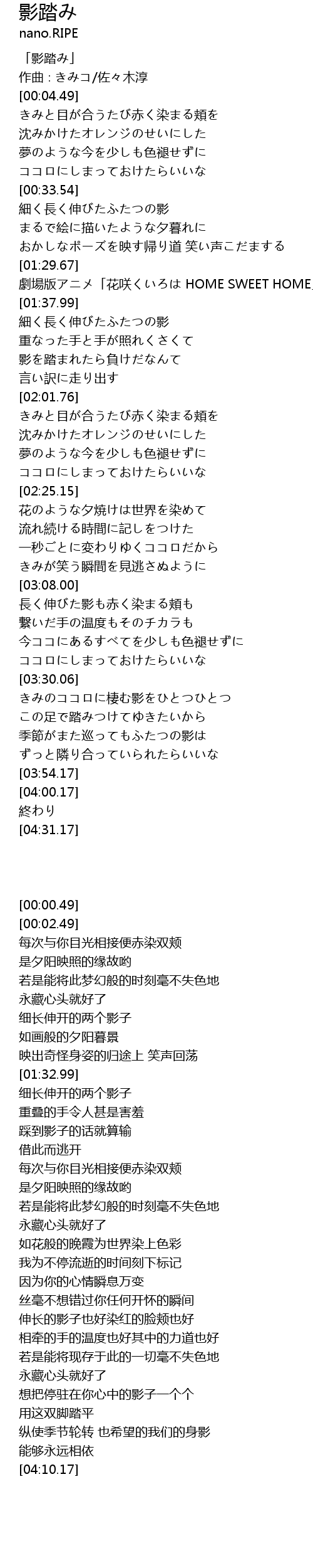 | [01:07.97] | 細く長く伸びたふたつの影 |