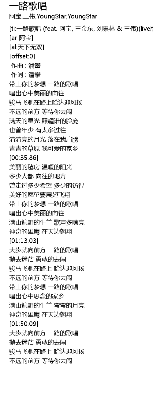 | [ti:一路歌唱 (feat. 阿宝, 王金东, 刘果林 & 王伟)(live版)] | |