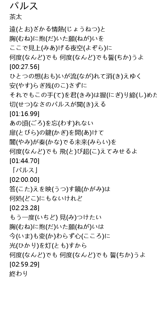 | [01:07.42] | 切(せつ)なさのパルスが聞(き)える |
