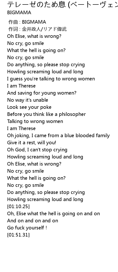 | [01:37.48] | Oh, Elise what the hell is going on and on |