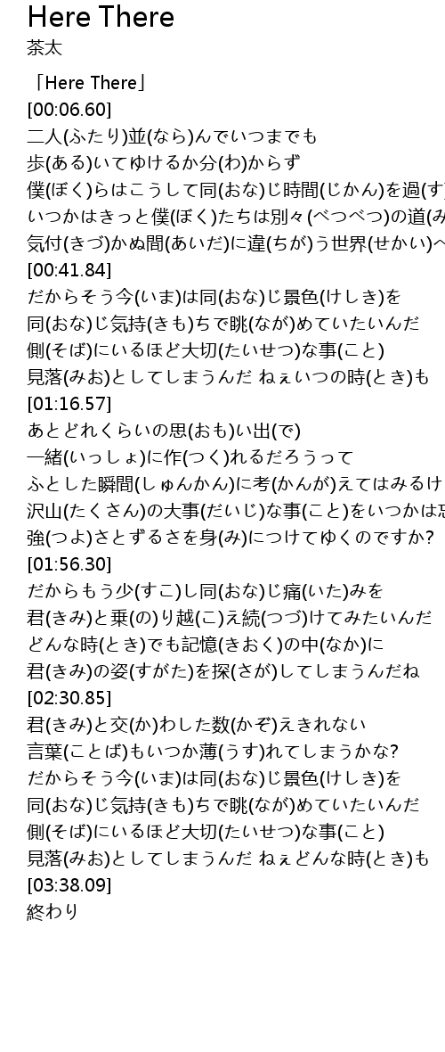 | [00:33.69] | 気付(きづ)かぬ間(あいだ)に違(ちが)う世界(せかい)へゆくでしょう |