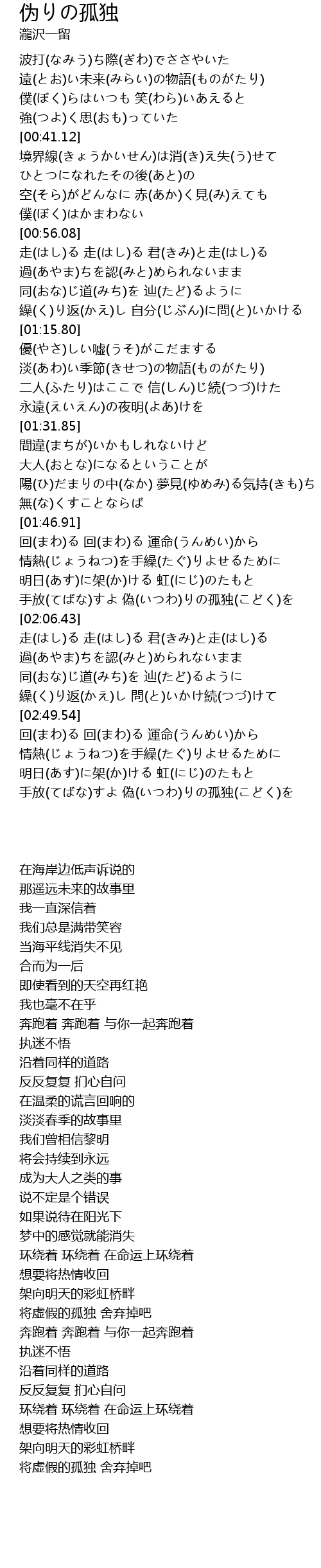 | [01:58.77] | 手放(てばな)すよ 偽(いつわ)りの孤独(こどく)を |