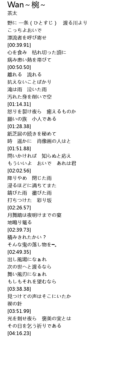 | [02:20.54] | 打ちつけた 彩り坂 |