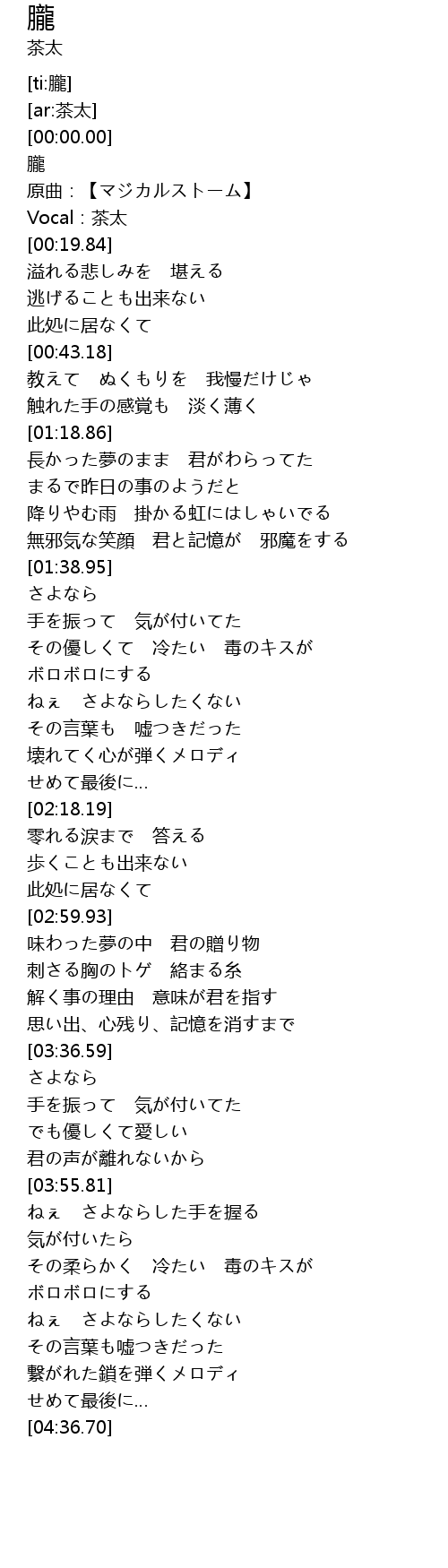 | [04:05.85] | その柔らかく 冷たい 毒のキスが |