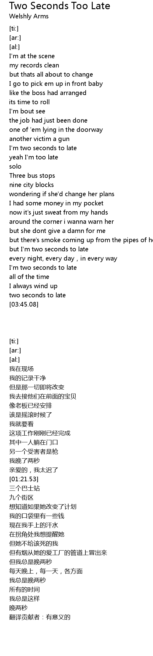 | [02:19.36] | but I'm two seconds to late |