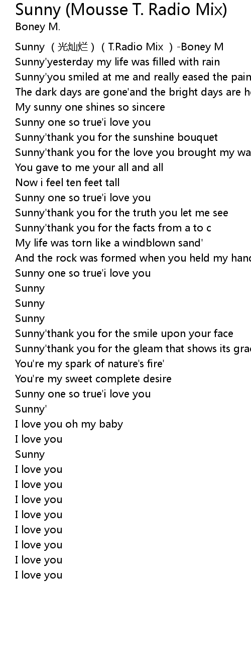 | [00:00.00] | Sunny (光灿烂)(T.Radio Mix )-Boney M |