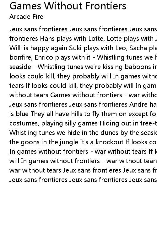 Jeux sans frontieres Jeux sans frontieres Jeux sans frontieres Jeux sans frontieres Hans plays with Lotte, Lotte plays with Jane Jane plays with Willi, Willi is happy again Suki plays with Leo, Sacha plays with Britt Adolf builts a bonfire, Enrico plays with it - Whistling tunes we hide in the dunes by the seaside - Whistling tunes we're kissing baboons in the jungle It's a knockout If looks could kill, they probably will In games without frontiers - war without tears If looks could kill, they probably will In games without frontiers - war without tears Games without frontiers - war without tears Jeux sans frontieres Jeux sans frontieres Jeux sans frontieres Andre has a red flag, Chiang Ching's is blue They all have hills to fly them on except for Lin Tai Yu Dressing up in costumes, playing silly games Hiding out in tree-tops shouting out rude names - Whistling tunes we hide in the dunes by the seaside - Whistling tunes we piss on the goons in the jungle It's a knockout If looks could kill they probably will In games without frontiers - war without tears If looks could kill they probably will In games without frontiers - war without tears Games without frontiers - war without tears Jeux sans frontieres Jeux sans frontieres Jeux sans frontieres Jeux sans frontieres Jeux sans frontieres Jeux sans frontieres ... |