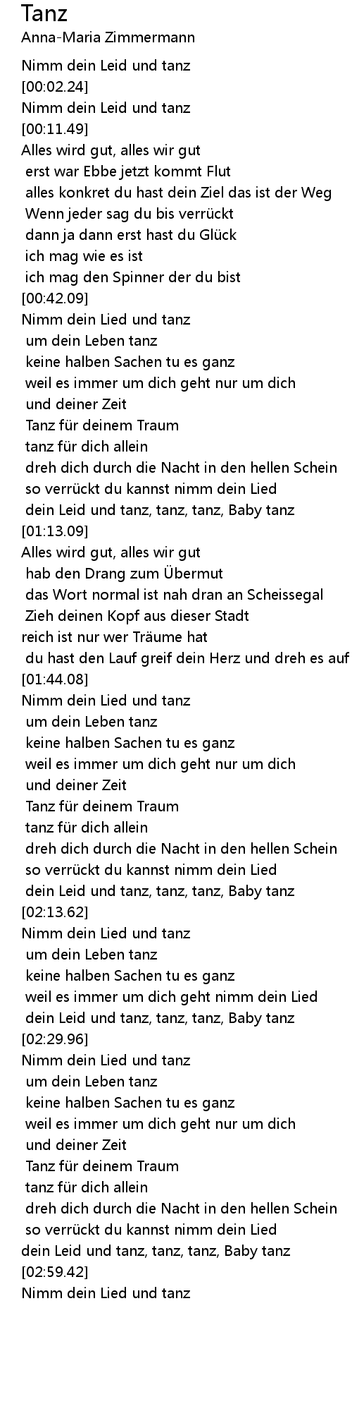 | [02:09.92] | dein Leid und tanz, tanz, tanz, Baby tanz |