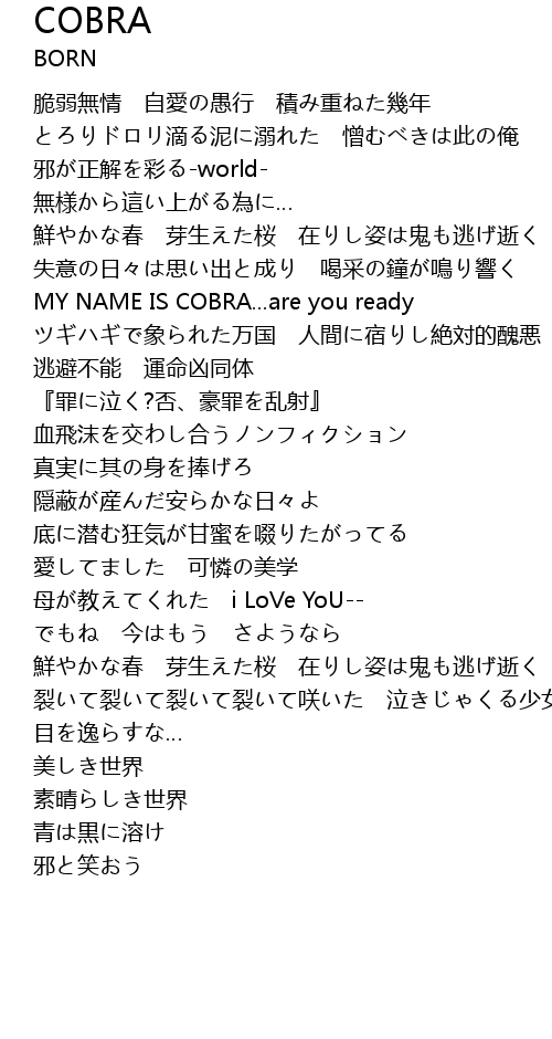 | [01:57.529] | MY NAME IS COBRA... are you ready |