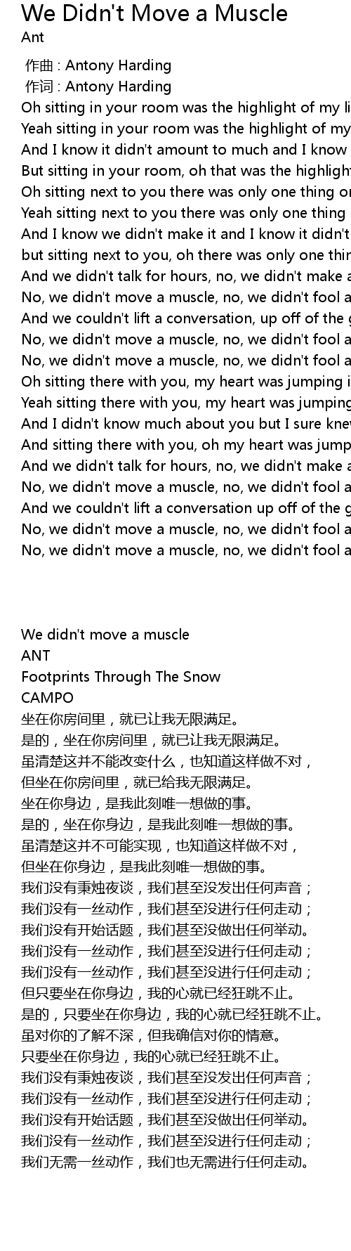 | [02:21.500] | No, we didn' t move a muscle, no, we didn' t fool around. |