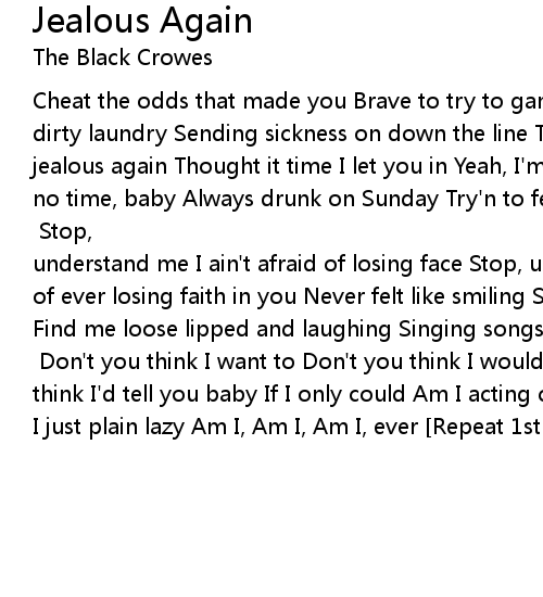 Cheat the odds that made you Brave to try to gamble at times Well I feel like dirty laundry Sending sickness on down the line Tell you why 'Cause I'm jealous, jealous again Thought it time I let you in Yeah, I'm jealous, jealous again Got no time, baby Always drunk on Sunday Try'n to feel like I'm at home Smell the gasoline burning Boys out feeling nervous and cold [Repeat 1st Chorus] Stop, understand me I ain't afraid of losing face Stop, understand me I ain't afraid of ever losing faith in you Never felt like smiling Sugar wanna' kill me yet Find me loose lipped and laughing Singing songs ain't got no regrets [Repeat 1st and 2nd Chorus] Don't you think I want to Don't you think I would Don't you think I'd tell you baby If I only could Am I acting crazy Am I just too proud Am I just plain lazy Am I, Am I, Am I, ever [Repeat 1st Chorus] |