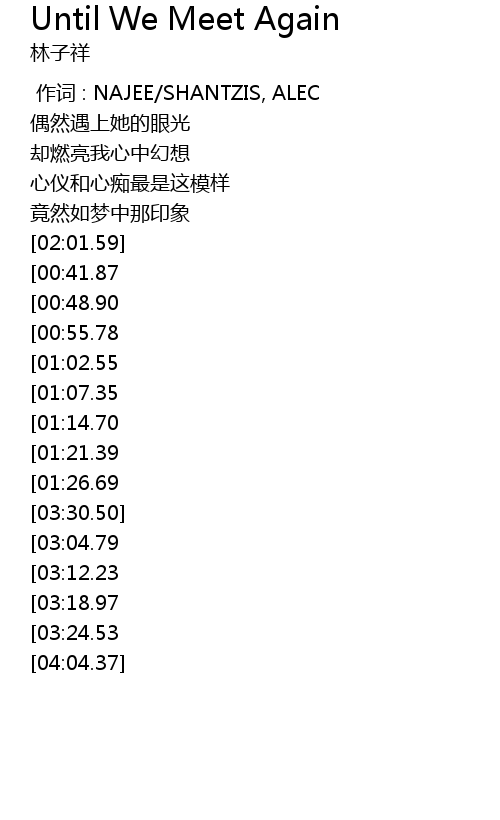 | [03:55.28][03:24.53][01:54.40] | Until We Meet Again |