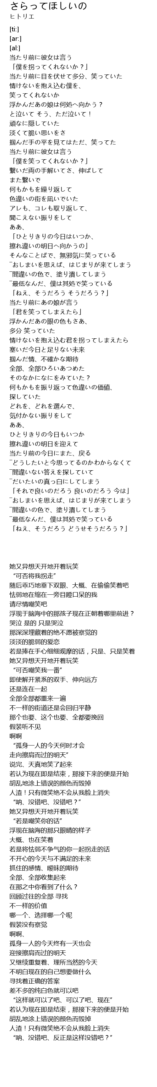 | [02:33.34] | 情けないを抱え込む君を拐ってしまえたら |
