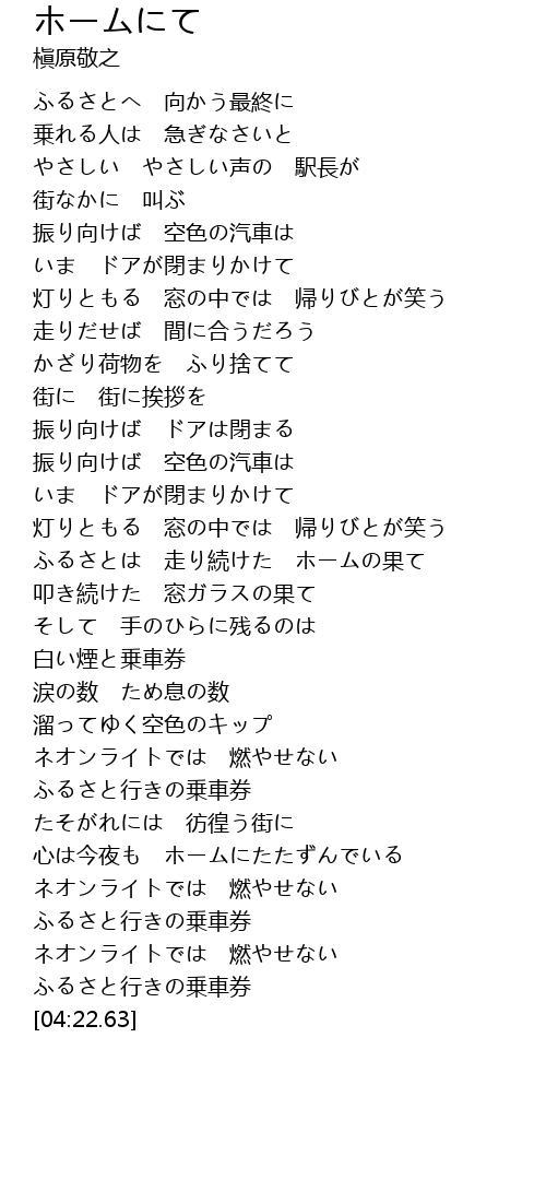 | [02:24.31] | ふるさとは 走り続けた ホームの果て |