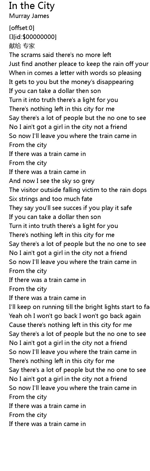 | [03:26.177] | No I ain' t got a girl in the city not a friend |