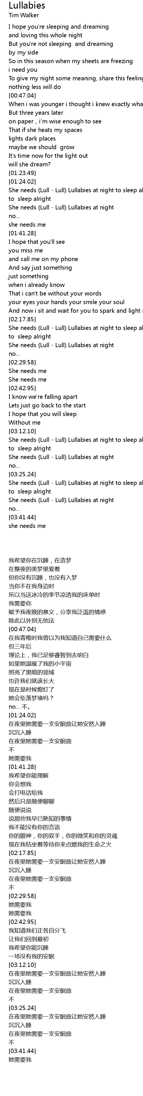 | [03:13.58] | She needs (Lull - Lull) Lullabies at night to sleep alright |