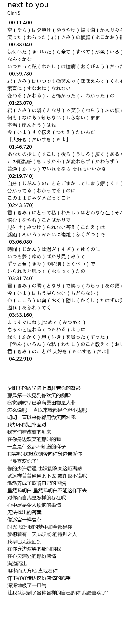 | [04:03.930] | 『色ん(いろん)な私(わたし)のこと教えて(おしえて)くれた 君(きみ)のことが 大好き(だいすき)だよ』 |