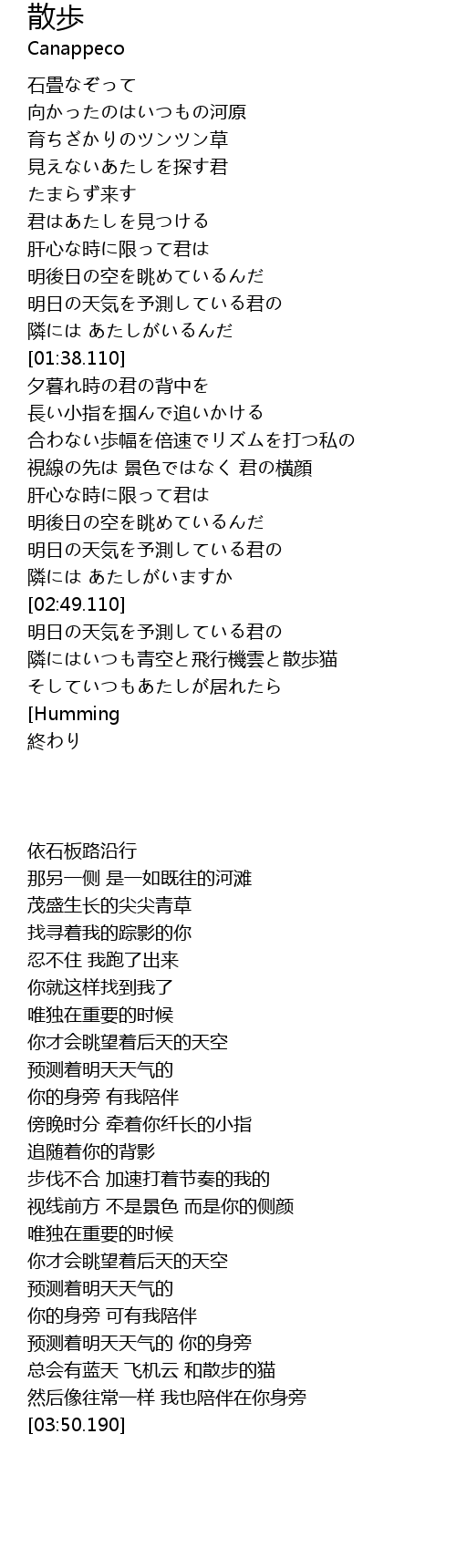 | [03:00.230] | 隣にはいつも青空と飛行機雲と散歩猫 |