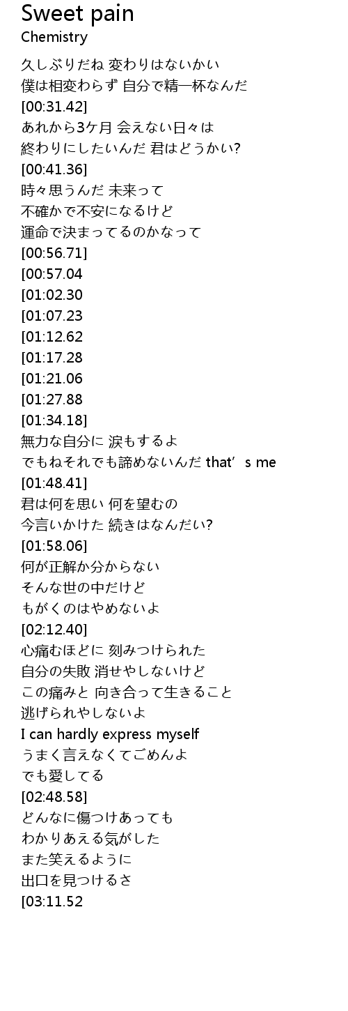 | [03:32.74][01:17.28] | I can hardly express myself |