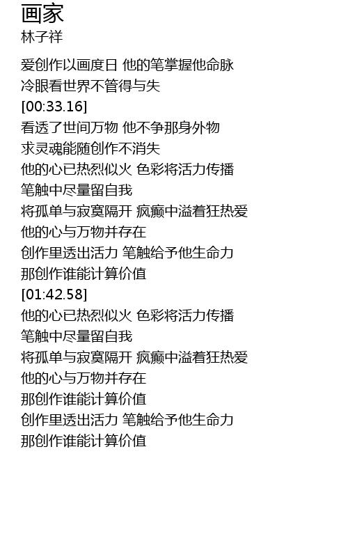 | [01:27.43] | 创作里透出活力 笔触给予他生命力 |