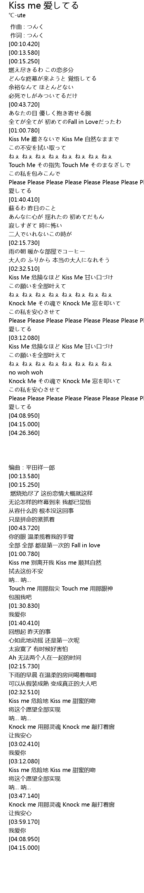 | [01:02.360] | Kiss Me 離さないで Kiss Me 自然なままで |